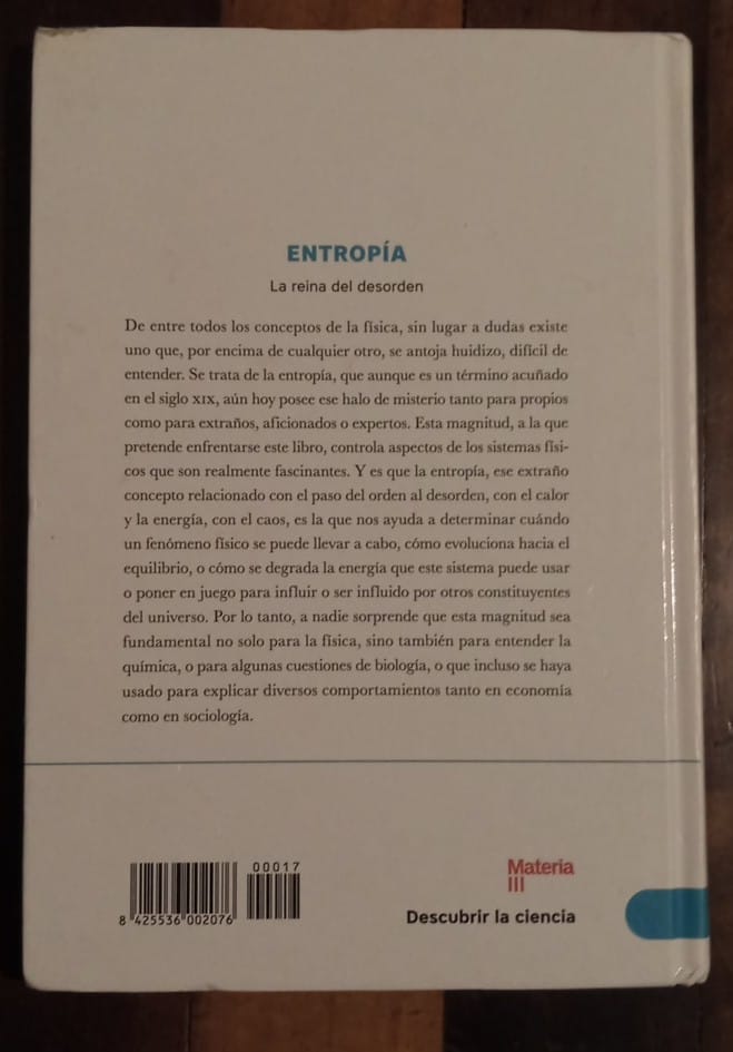 De entre todos los conceptos de la física, sin lugar a dudas existe uno que, por encima de cualquier otro, se antoja huidizo, difícil de entender. Se trata de la entropía que [aún] hoy posee ese halo de misterio tanto para propios como para extraños. [La] intención a la hora de escribir este libro fue que resultase interesante e instructivo tanto para la gente aficionada a la física como para los expertos. [Para] los expertos, es evidente que este texto no pretende enseñar nada nuevo, pero [tal] vez aquí se encuentre [alguna] idea sobre la que no se había reflexionado con anterioridad».